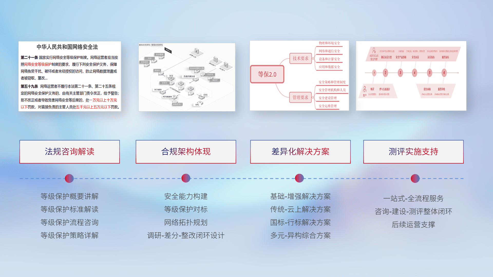 通过专业的法律咨询解读、、、、合规架构体现、、差异化解决方案、、测试实施支持等服务,,,为客户量身打造等保合规体系。。。。