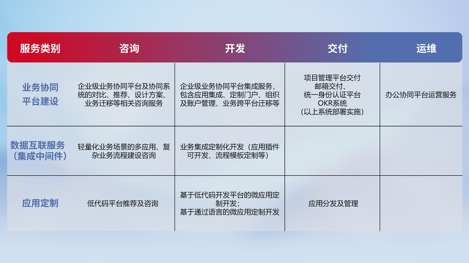 针对钉钉、、、企微、、、、IDaas等平台级产品提供产品的规划、、、方案、、、、交付、、、定制化开发等服务,,,实现如统一协同办公、、、、智能客户服务、、混合会议管理、、、智能数据查询、、、、等业务场景,,,实现数字化转型。。。。